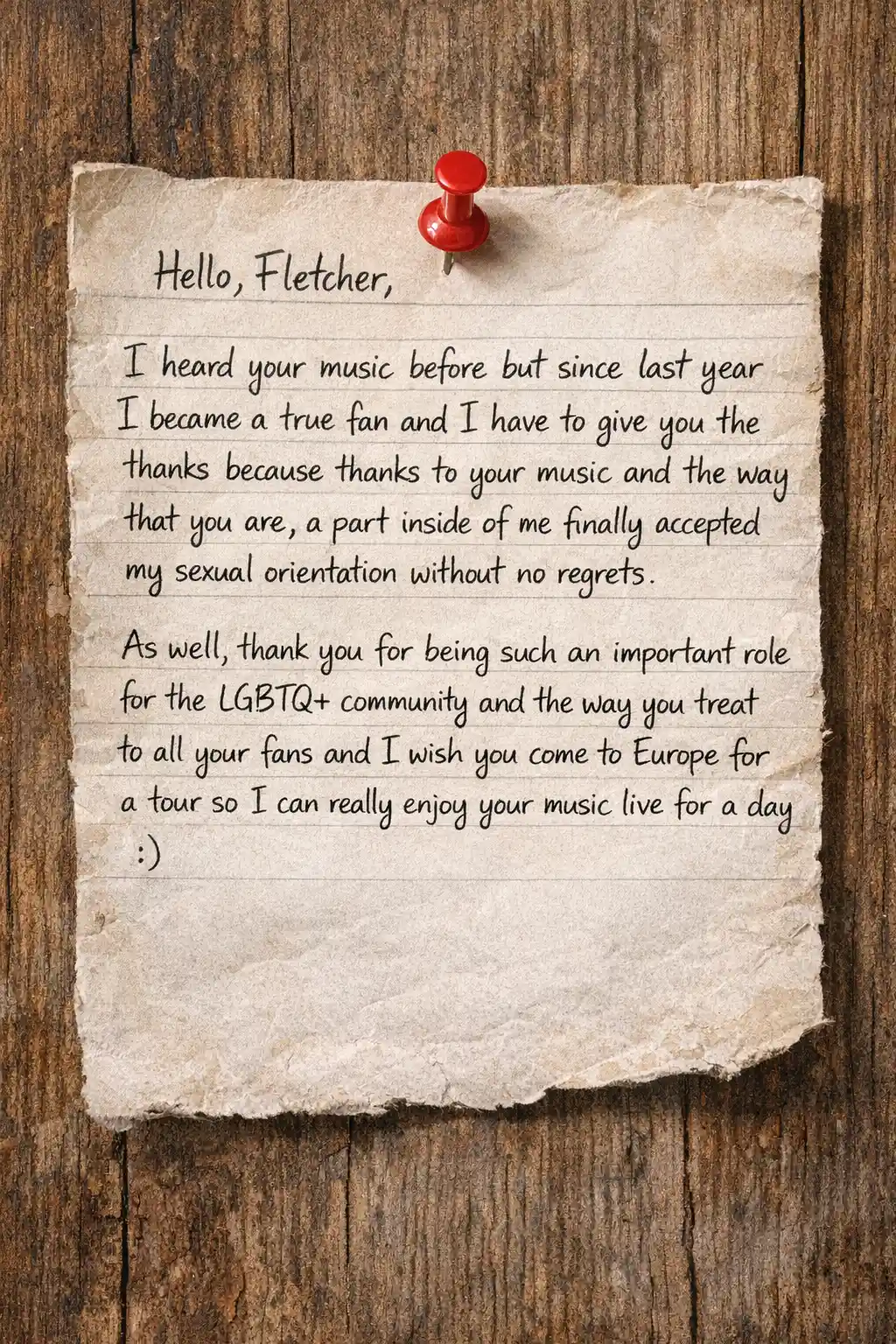 Hello, Fletcher. I heard your music before but since last year I became a true fan and I have to give you the thanks because thanks to your music and the way that you are, a part inside of me finally accepted my sexual orientation without no regrets. As we